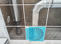 Die Abluft wird an der Saalrückwand abgesaugt. Bei der gewählten Konzeption erfolgt die Wärmerückgewinnung über ein Kreislaufverbundsystem. Die schwierigen Platzverhältnisse erforderten eine genaue Planung und intensive Überwachung der Ausführung.