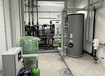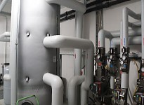 Die Wärmeversorgung erfolgt zum einen über eine Wärmeleitung aus der bestehenden Heizzentrale. Zum anderen wird eine Sole-Wasser-Wärmepumpe eingesetzt.