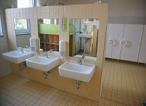 Neben den üblichen Kita-spezifischen Anforderungen an die Gebäudetechnik in einer Kindereinrichtung, die vor allem auch den Sanitärbereich mit seiner für die verschiedenen Altersgruppen spezifischen Ausstattung umfasst, war die Lage in der Nähe einer verkehrsreichen Straße von Bedeutung.