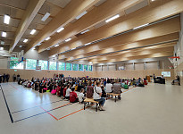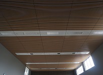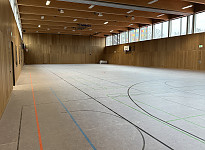 Ausstattung der Sporthalle mit Schwingbodenheizung. Die Lüftungsauslässe wurden otpisch formschön in die Deckengestaltung integriert.