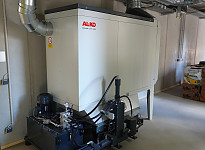 Die Wärmeerzeugung erfolgt durch 50 m² Sonnenkollektoren, einen Hackschnitzel-Holzkessel und einen Gaskessel.